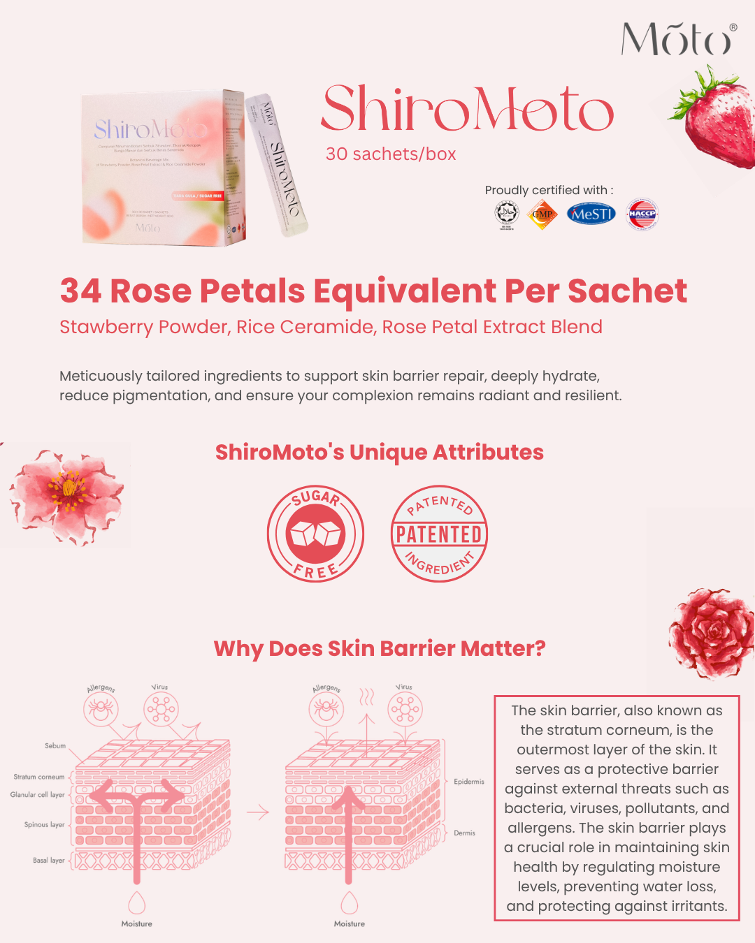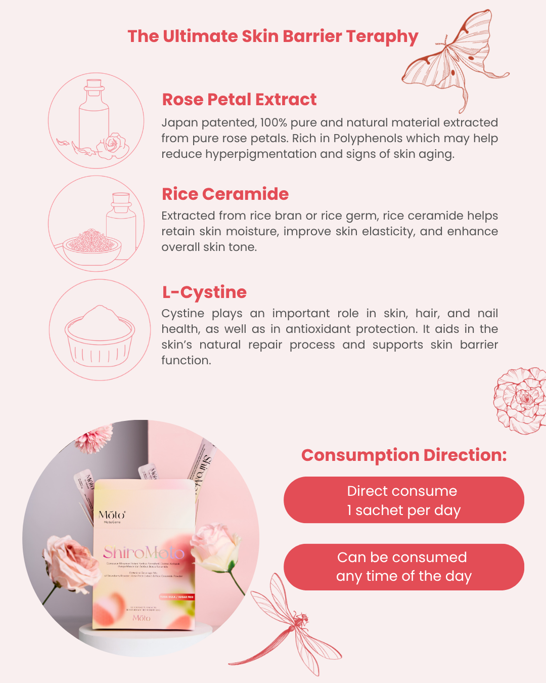 ShiroMotoは、ローズペタルエキス、米由来セラミド、ビタミンB群などの栄養成分を配合し、肌の健康を整えるために設計されています。